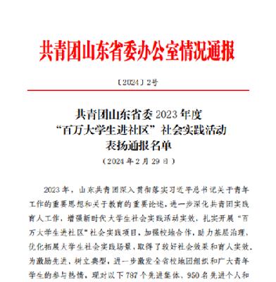 山东共青团深入贯彻落实习近平总书记关于青年工作的重要思想和关于教育的重要论述,进一步深化共青团实践育人工作,增强新时代大学生社会实践活动实效,扎实开展“百万大学生进社区”社会实践项目,加强校地合作,助力基层治理,优化拓展大学生社会实践场景,取得了较好社会效果和育人实效