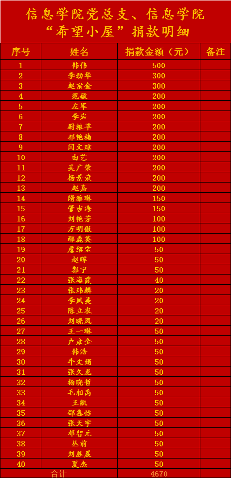 下一步,信息学院党总支、团总支将继续立足实际,担当作为、砥砺奋进,我们将及时把募得的资金全部用于“希望小屋”项目,在公益事业中检验党史学习教育成果,用责任与担当,守护更多贫困家庭儿童的成长与梦想,让“希望小屋”奏响大爱之声,努力为青少年提供新助力、播种新希望。