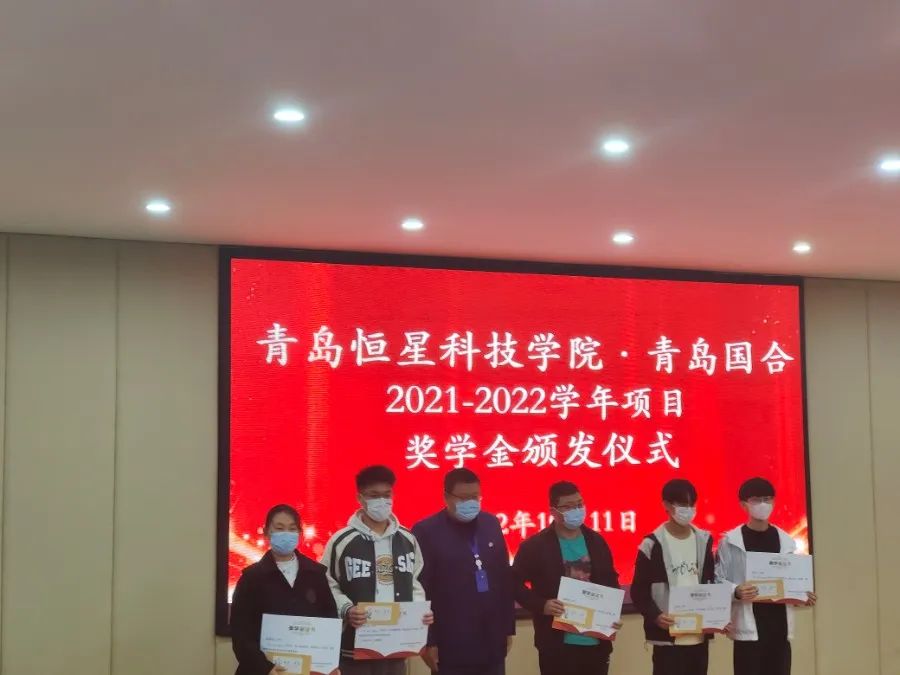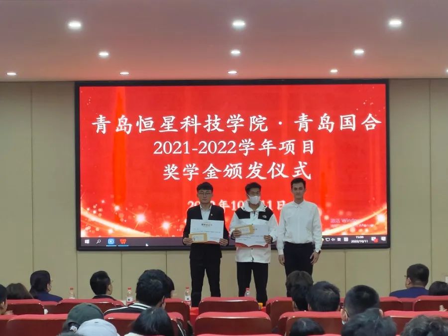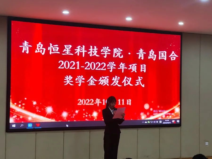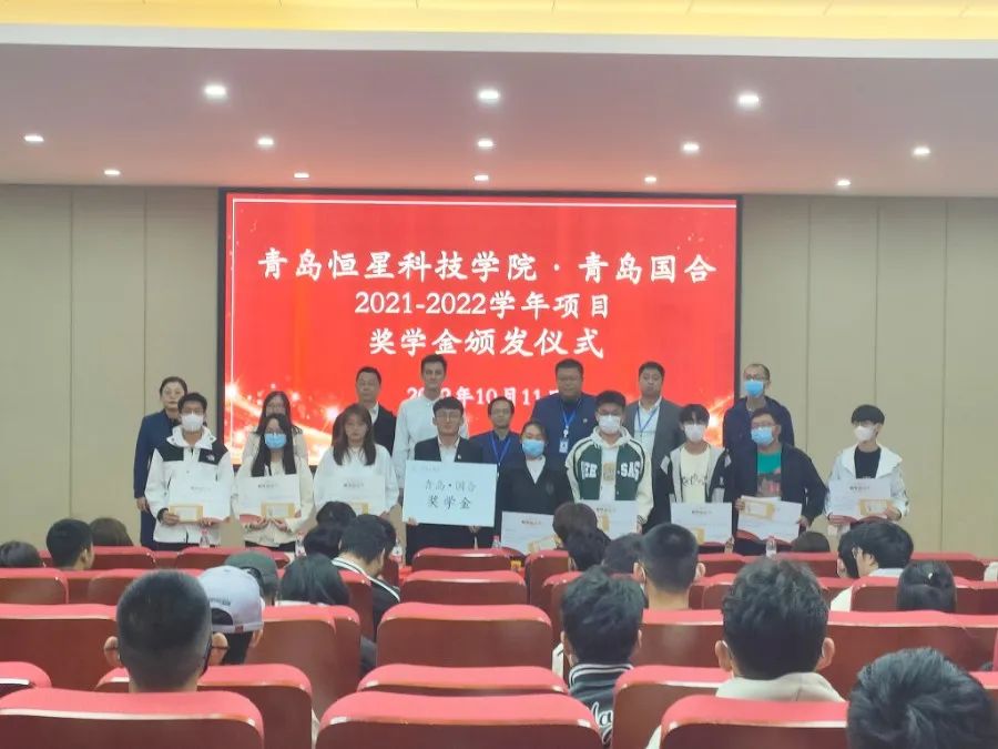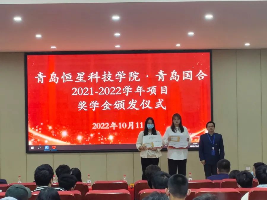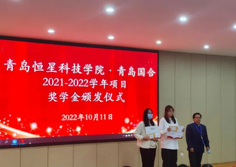 ”随着刘江坤同学的精彩发言之后,进行颁奖仪式第四项:青岛恒星科技学院领导与青岛国合对外经济技术合作有限公司企业代表为获得奖学金的同学颁奖。
