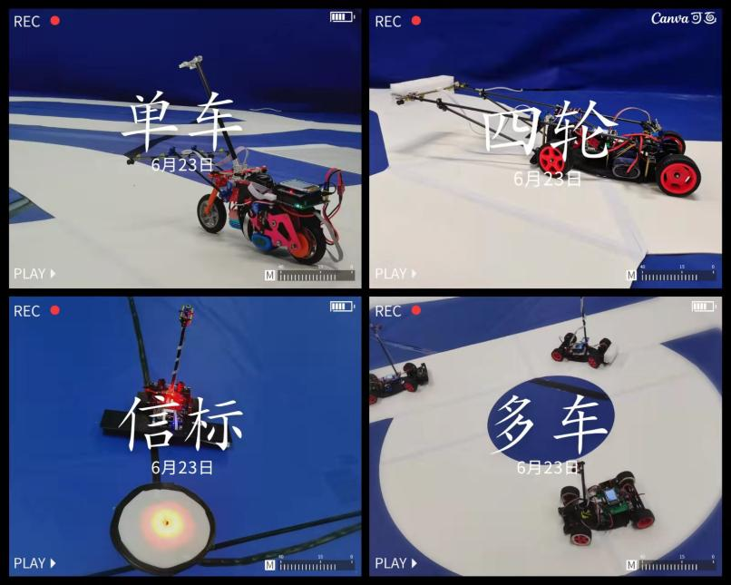 本次校内赛包含传统的四轮电磁、四轮摄像头项目,增加了较为新颖的多车编队、平衡单车、平衡信标和极速越野创新竞赛项目,共有15支队伍参赛,三分钟内任意发车,取最好成绩为最终成绩。