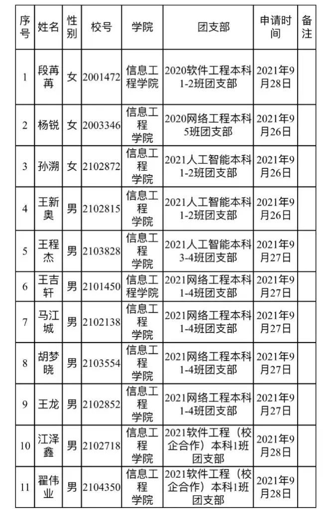 现将信息工程学院2022年度拟发展新团员名单公示如下: