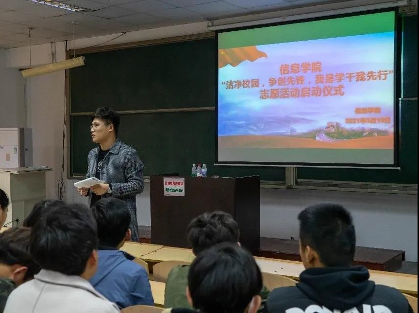 为贯彻落实习近平总书记关于新时代爱国卫生工作的重要指示和教育系统深入开展爱国卫生运动的总体部署,培养大学生树立正确的劳动观念、形成良好的劳动习惯,信息学院于2021年3月10日下午16点,在铭志楼(A4)306教室开展以“洁净校园,争创先锋,我是学干我先行”为主题的志愿活动启动仪式,党员、入党积极分子、以及全体学生会成员齐上阵,共建整洁、美丽的学院环境,推动文明绿色校园建设。