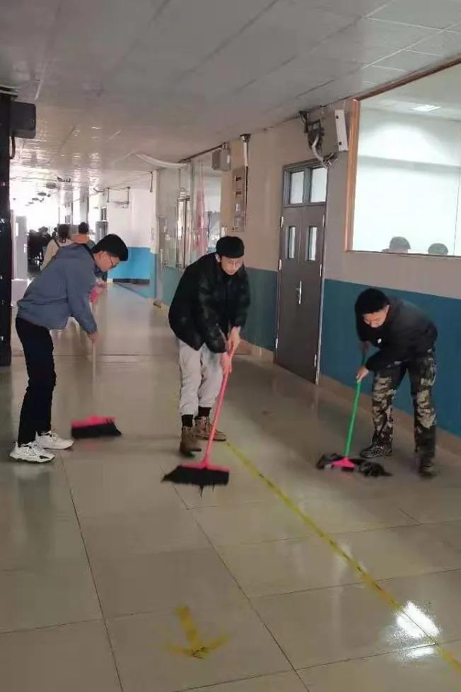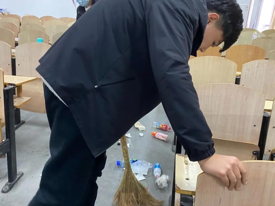 学院里的各个公开课大教室,随处可见手持劳动工具,如火如荼地投身于劳动中的同学们,每间教室部门之间分工明确,每位成员的劳动分工合作恰到好处,使得大扫除活动井然有序的进行着。