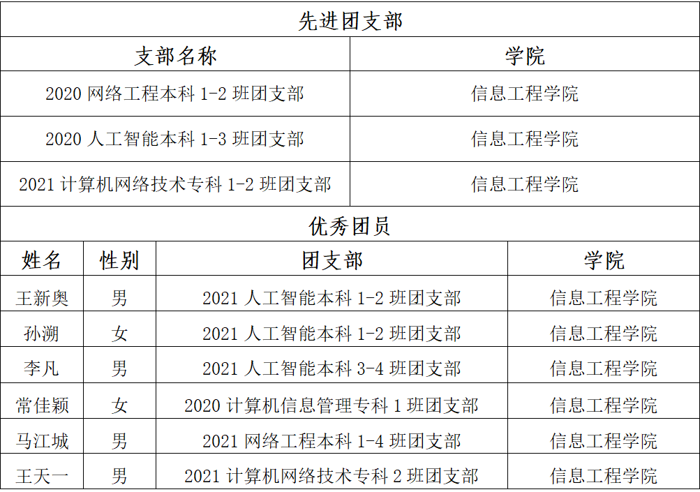 按照青恒团发【2023】002号文件精神,在推荐共青团青岛恒星科技学院委员会“2023年先进团支部、优秀团员”的过程中,学院于2023年2月15日在青岛恒星科技学院信息工程学院网站及公众号公示了“关于推选青岛恒星科技学院信息工程学院2023年先进团支部、优秀团员名单的公示”,在2023年2月15日-2月19日公示五天,无任何异议。同意推选以下团支部和同学,成为本年度“先进团支部、优秀团员”。