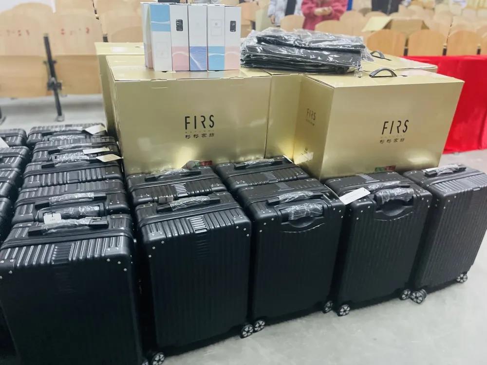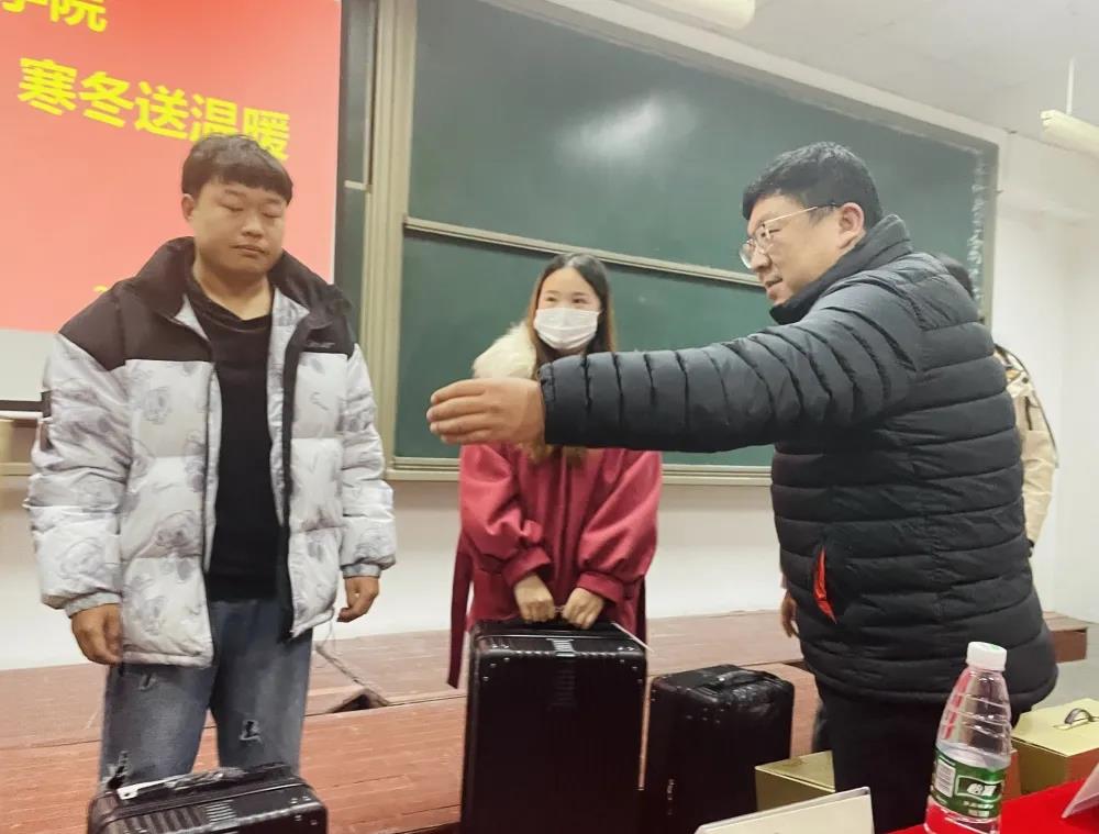 接下来,信息学院院务会领导们为19名同学送上羽绒被、行李箱、保温杯等爱心物品,并亲切地问候、鼓励他们面对生活中的困难和挫折要乐观积极、自强不息。