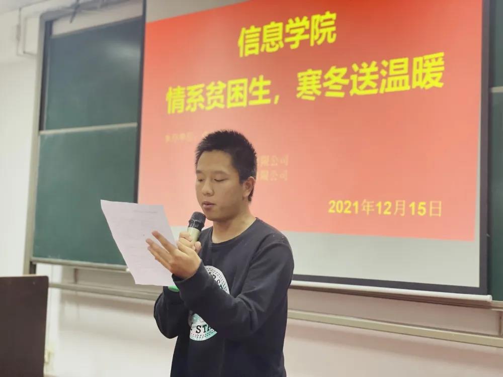 为进一步贯彻落实党的十九届六中全会精神,落实国家对家庭经济困难学生的资助政策和对困难学生的关怀。信息学院党总支于12月15日下午16:00在近思楼A4-308教室举办“情系贫困生,寒冬送温暖”活动。