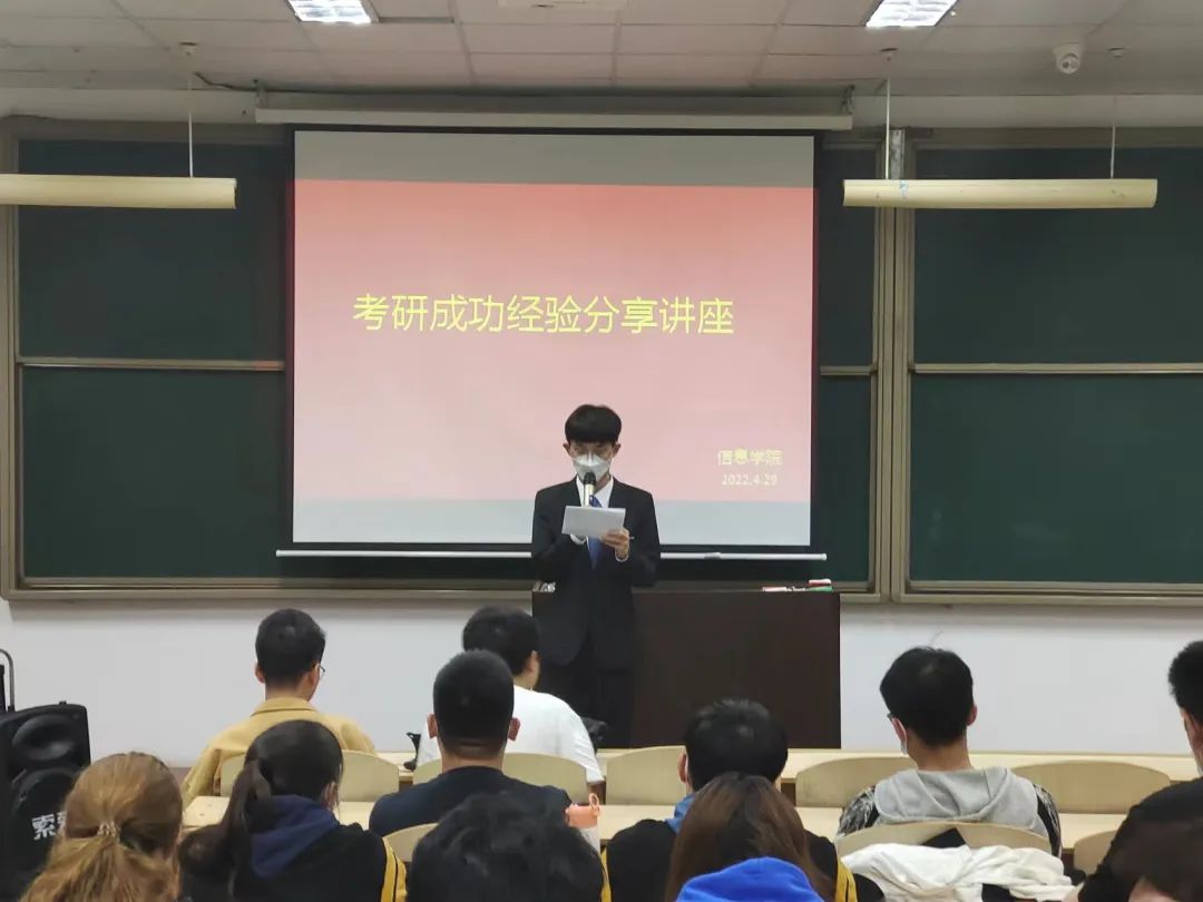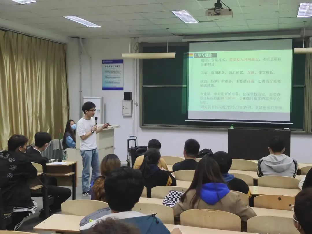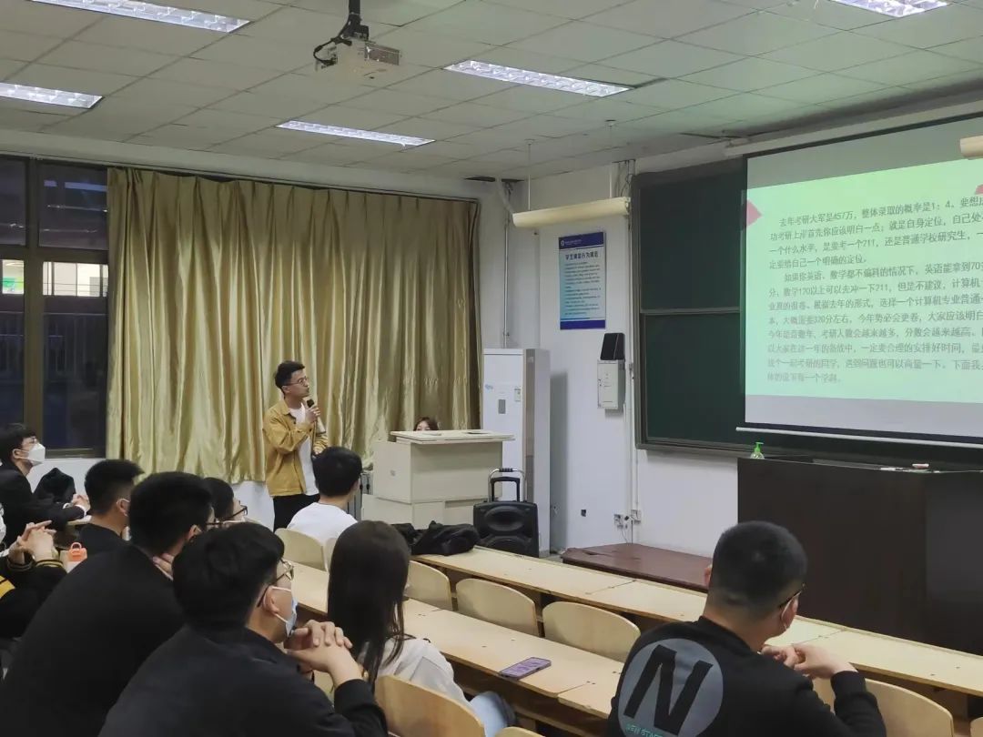 恰同学少年,风华正茂,信息学子以青春之火,为母校恒星挥洒青春热血。随着考研复试的结束,2022年研究生考试工作也落下了帷幕。国家线上涨,考研形势愈发严峻,为了帮助同学们更好地了解考研形式,明确考研方向,合理制定复习计划,信息学院于2022年4月29号在近思楼302教室开展“考研成功经验分享讲座”。此次讲座邀请了两名2018级软件工程班级考研成功上岸的学长为学弟学妹们介绍成功上岸经验。首先是18级软工赵世龙学长,他和大家分享了自己学习的经验: