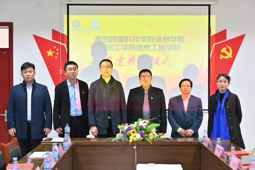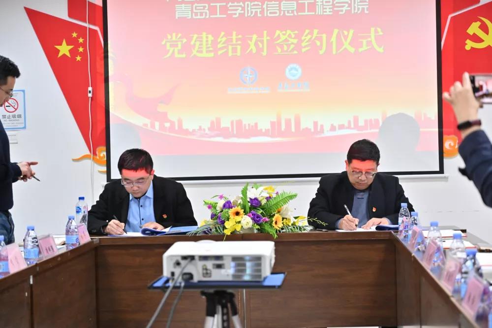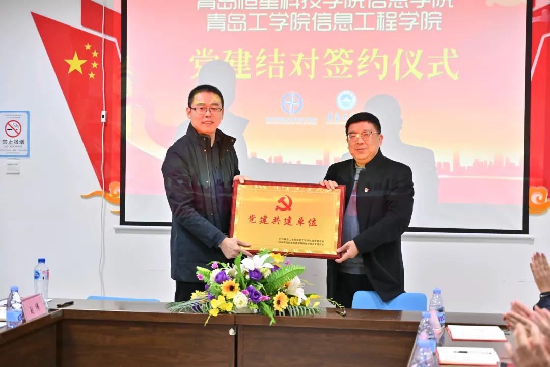 青岛恒星科技学院信息学院党总支书记韩伟与信息工程学院党总支代理副书记郭超代表双方签署党建结对共建协议。