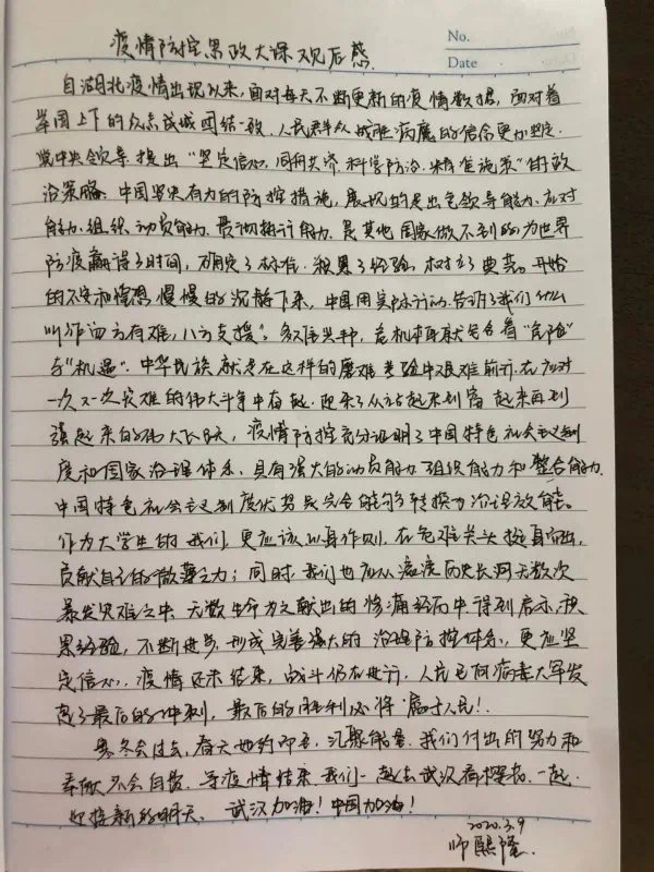 生于种花家,何其荣幸?中国战“疫”,凝聚中国力量,彰显大国担当。这力量与担当体现在举国上下一心,不遗余力调配各类资源,力争做到应收尽收、不漏一人;体现在基层社区严防死守,外防输入,内防扩散,不留死角;体现在火神山医院、雷神山医院接连建成,超级速度,超级震撼;体现在战“疫”一线屡屡上演“最美逆行”,汇聚中国力量,众志成城,共克时艰......越是苦难越自律,越是艰险越向前。一场重大疫情,也是一场人生大课。