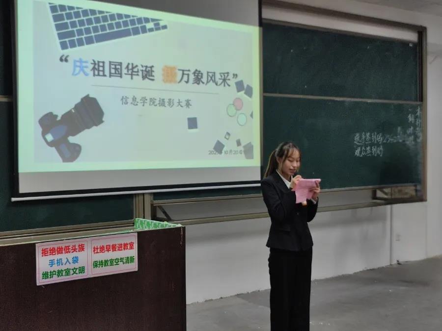 为了弘扬爱国主义精神,培养广大学生的历史责任感,使命感和高尚的爱国情操,增强大学生责任意识,信息学院在10月20日下午7:00于铭志楼a4-306开展“庆祖国华诞,摄万象风采”的摄影大赛。