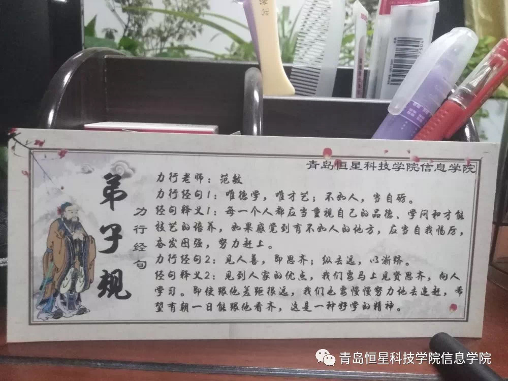 为了落实中华优秀传统文化进校园,贯彻学校关于传统文化的发展规划,信息学院积极相应号召,在老师队伍中积极力行传统文化,学院每位老师从《弟子规》中选取两件经句作为自己的力行事件,贴于桌前,使老师们时时刻刻都能提醒自己,反省自己,提升自己。