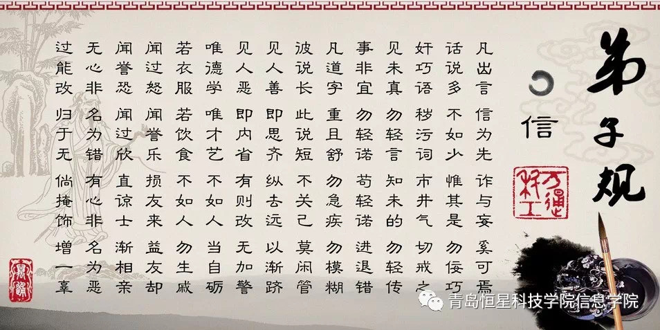 《弟子规》原名《训蒙文》,为清朝康熙年间秀才李毓秀所作,其内容采用《论语》"学而篇"第六条"弟子,入则孝,出则弟,谨而信,泛爱众,而亲仁,行有余力,则以学文"的文义,全书共有360句、1080个字、113件事,讲述了很多的处事标准。