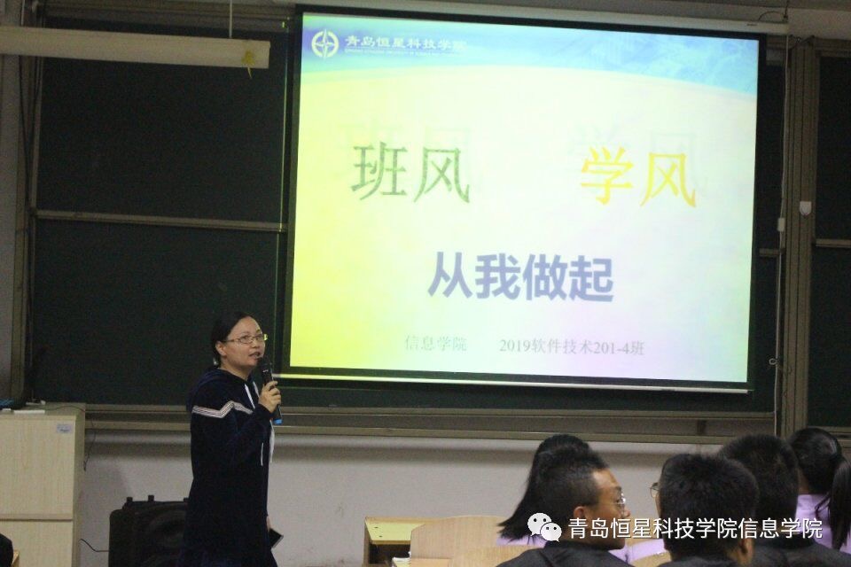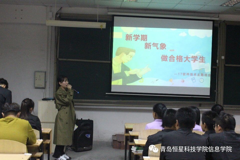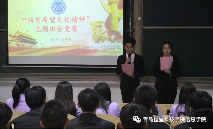 为进一步提高我院班级管理质量和教师队伍整体素质,充分发挥主题班会在班集体价值的形成、学生自主教育和自主管理、实现师生平等、互动、沟通的教育整合功能,青岛恒星科技学院信息学院于10月28日下午四点在A4 408教室举办“培育希望文化精神”主题班会大赛,出席本次活动的领导有:青岛恒星科技学院学生处导师科长任丽梅科长、学生处心理咨询师张玉环老师、装备学院思政院长张菲菲院长、信息学院思政院长左军院长、信息学院教学助理刘艳芳助理、信息学院行业院长王晓晴院长、信息学院行业院长李岩院长、信息学院文宣主任管吉海主任及信息学院全体老师和辅导员。
