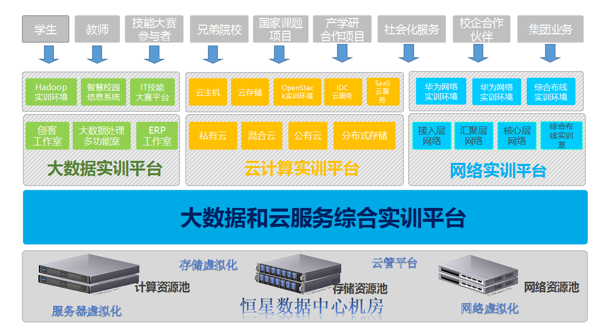 信息学院非常重视教科研平台建设,已建成大数据及云服务综合实训平台和恒星软件研究所。为学生实践训练提供了完备的场所。