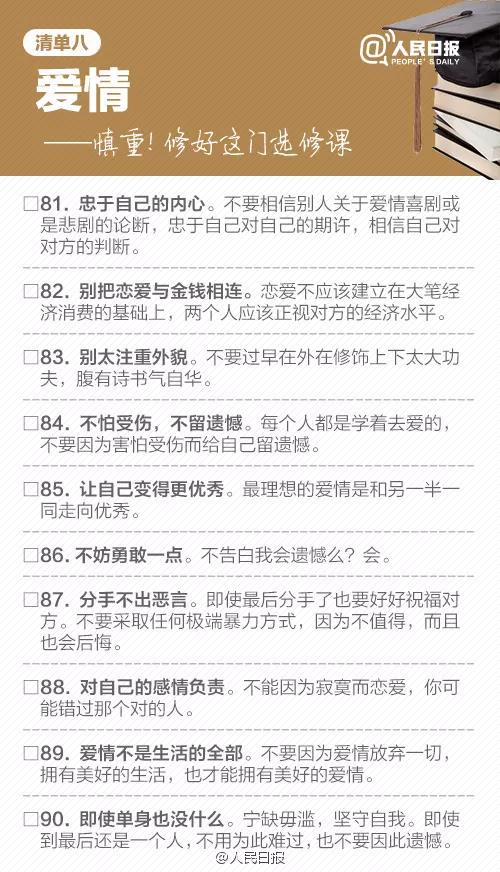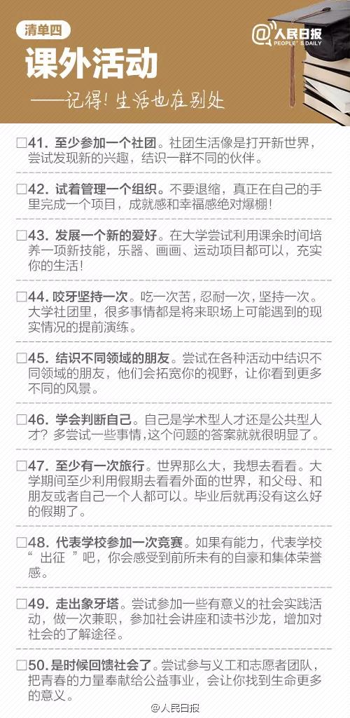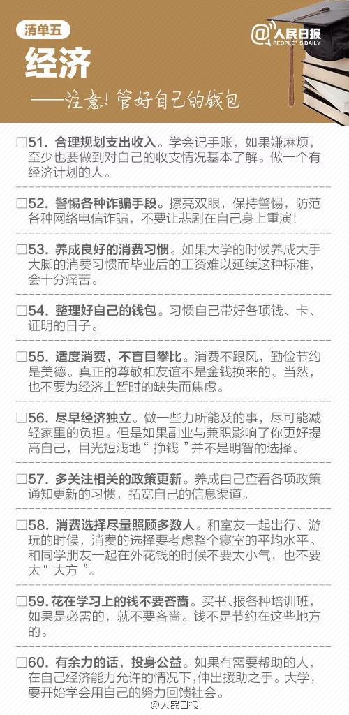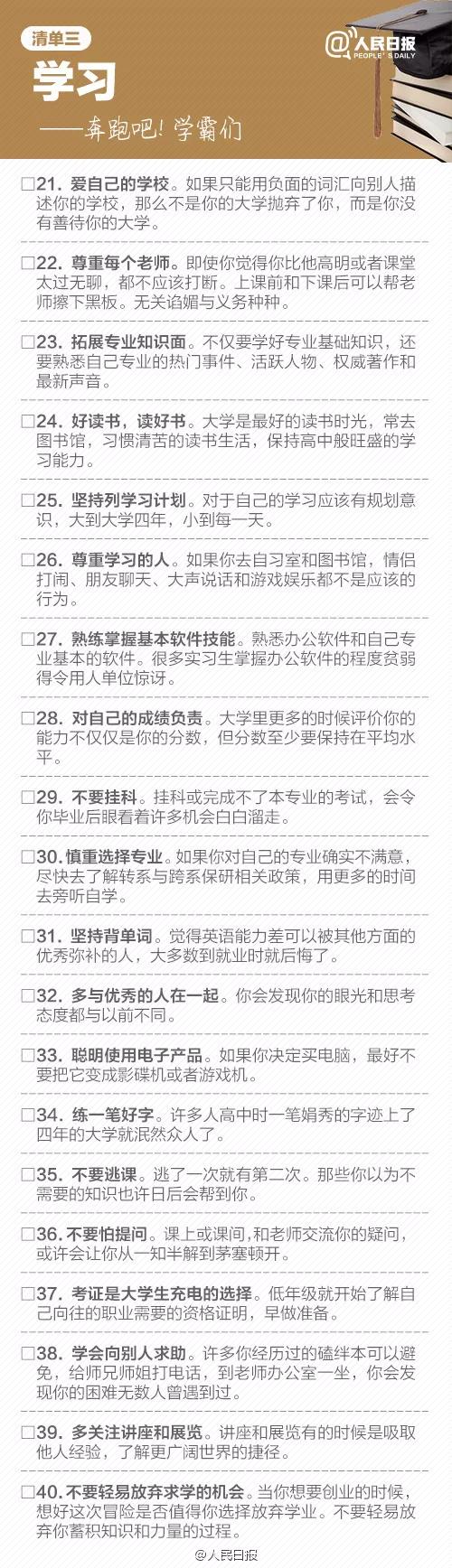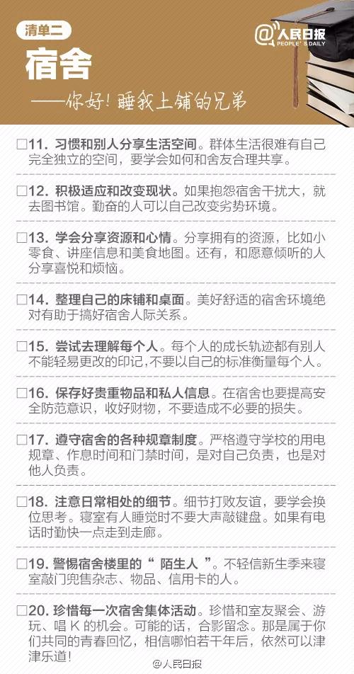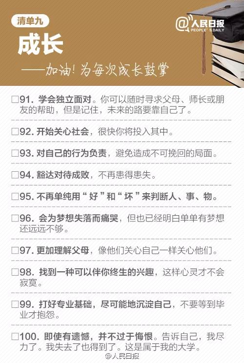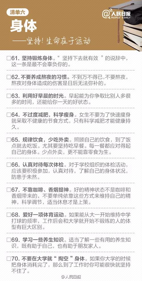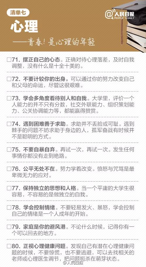 人民日报为新生在学业建设、身体和心理健康、个人成长等方面提供了100条忠告,对大一新生的学业生活和未来发展都将有非常大的帮助。