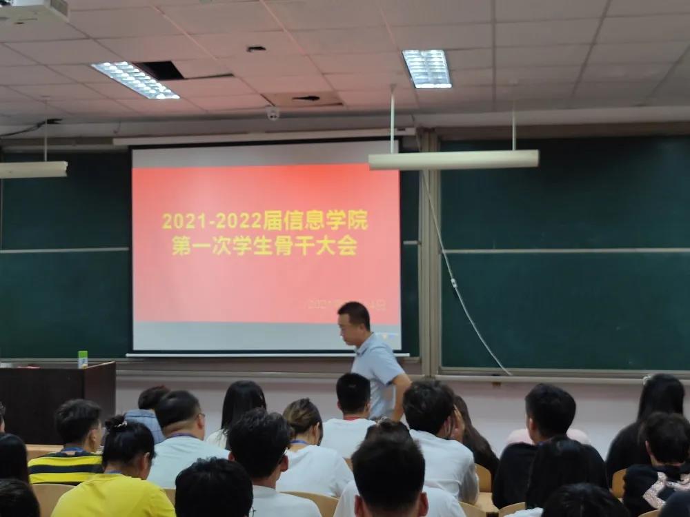 为号召信息学院学生骨干“为同学服务”的宗旨,加强思想政治教育,建设清新阳光的学生会。2021年9月14日下午16:30,信息学院于铭志楼A4-308教室召开2021-2022届信息学院第一次学生骨干大会。信息学院学生会主席团以及全体部长参加会议,会议由信息学院副书记左军主持。