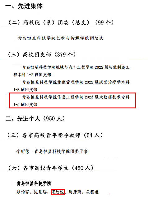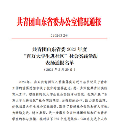山东共青团深入贯彻落实习近平总书记关于青年工作的重要思想和关于教育的重要论述,进一步深化共青团实践育人工作,增强新时代大学生社会实践活动实效,扎实开展“百万大学生进社区”社会实践项目,加强校地合作,助力基层治理,优化拓展大学生社会实践场景,取得了较好社会效果和育人实效。近日,共青团山东省委2023年度“百万大学生进社区”社会实践活动表扬通报名单公布,信息工程学院2023级大数据技术专科1-5班团支部获先进集体,学生宋欣悦获先进个人。