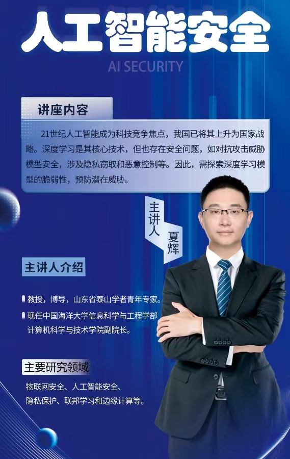 为提升学生的专业知识,信息工程学院于2024年3月11日下午16:00邀请了中国海洋大学信息科学与工程学部计算机科学与技术学院副院长夏辉在A4-302教室开展了关于人工智能安全领域的讲座。