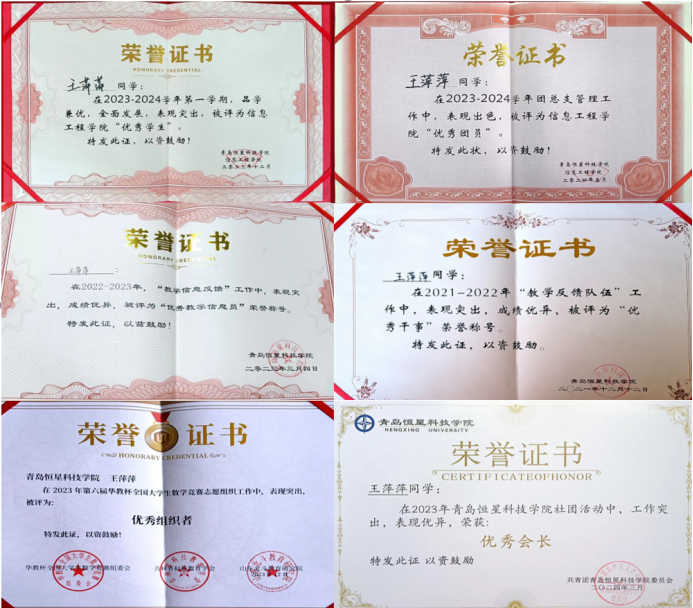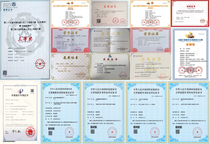 她在学业与竞赛领域表现卓越,成绩斐然。她学习成绩与综合素质评分在年级中始终名列前茅,稳居前5%。在学科竞赛的广阔舞台上,她亦是载誉而归:获得国家级奖项4项,省级奖项5项,于全国三维数字化创新设计大赛精英联赛中斩获国家级二等奖;在第十届“大唐杯”信息通信技术大赛信息通信工程实践赛里,荣获省级二等奖;在第二十五届中国机器人及人工智能大赛暨第三届山东省机器人及人工智能大赛中,取得省级三等奖。