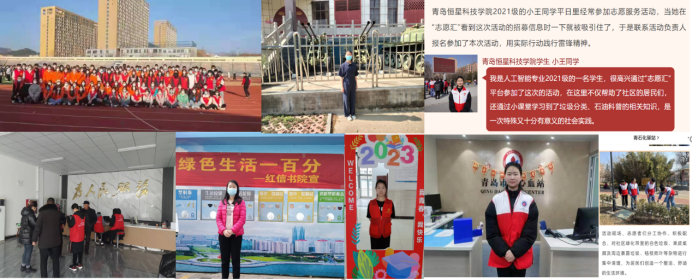 她始终怀揣着热忱之心,积极投身于各类志愿服务活动。在校期间,她参与学校组织的核酸检测志愿服务,在检测现场耐心引导师生,维持秩序,为校园防疫工作贡献力量;作为垃圾分类志愿者,她深入宣传环保知识,助力营造绿色校园环境。寒暑假如期而至,她并未停下志愿服务的脚步,积极参与“返家乡”志愿者活动,为家乡建设添砖加瓦;还踊跃加入“云支教”志愿者行列,跨越空间界限,为偏远地区的孩子们带去知识与希望。在2023年的“迎新生”志愿服务中,她热情迎接每一位初入校园的学子,耐心解答疑问,帮助新生顺利开启大学生活。2024年“雷锋月”,她参与了青岛石化组织的“弘扬雷锋精神,践行志愿服务”活动,其出色表现被青岛石化新闻和公众号报道。