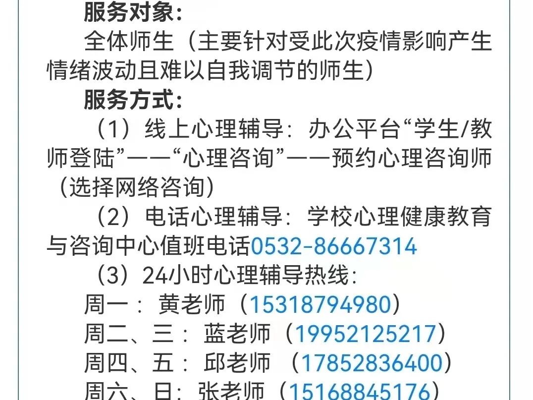三,针对校外的同学,做好疫情防护,非必要不出门,注意合理锻炼,稳定心态;针对校内同学,也要减少出门的必要,不要到处逛,学校周一到周日都为大家开放心理咨询辅导,服务方式分为两类:线上心理辅导和电话心理辅导。