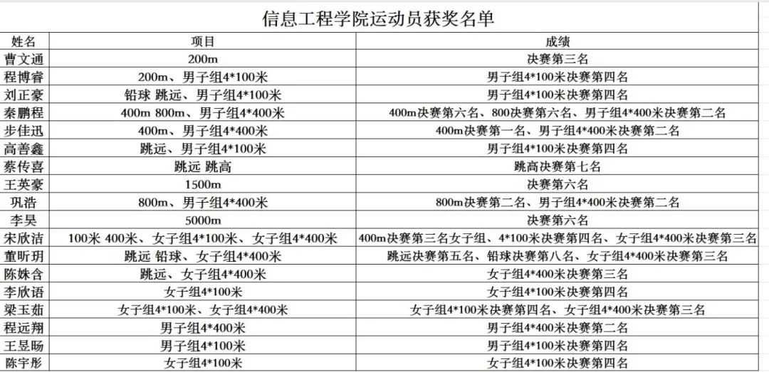 经过我院运动员凭借顽强的毅力和出色的团队协作,最终在本次运动会获得了优异的成绩,运动员名单如下: