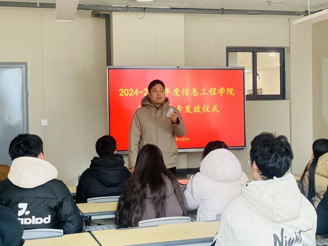 由信息工程学院党总支副书记张良为同学们讲述注意事项后奖助学金发卡仪式将正式开始。整个开卡流程严谨有序,张书记耐心地为同学们讲解奖助学金的发放细节以及银行卡的使用注意事项,展现了对学生们切实的关怀与支持,确保每一位符合条件的学生都能顺利地接收到这份关爱与鼓励。